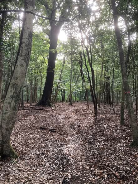 神宮林、常緑樹林を過ぎて、アカマツ、ハリギリ、ウリハダカエデ、ホオノキ、