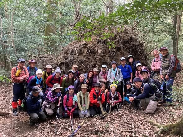 大きな倒木が増えてきました。根っこをバックに記念写真。